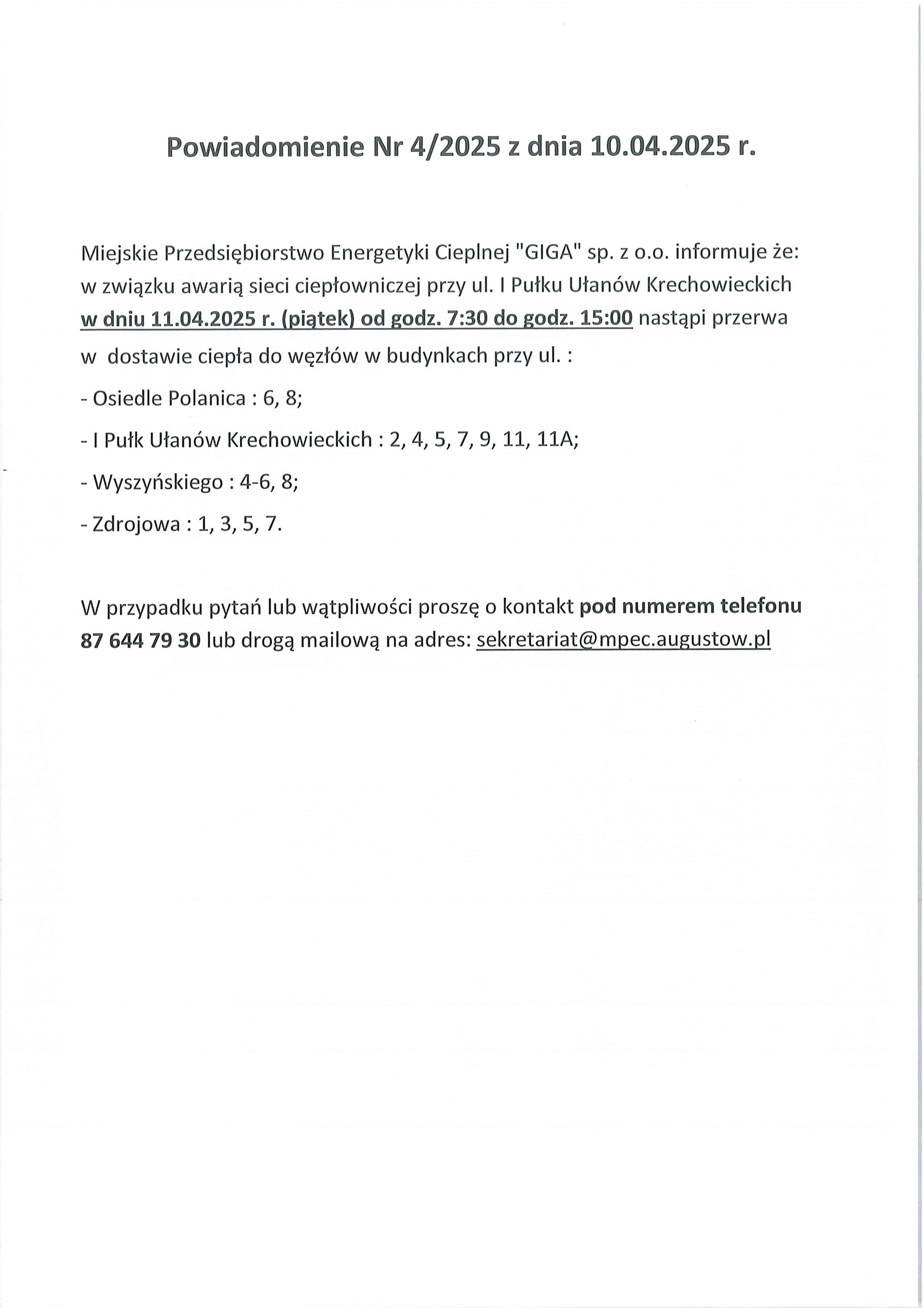 - Informacja Miejskiego Przedsiębiorstwa Energetyki Cieplnej "GIGA" Sp. z o.o. w Augustowie odnośnie zmiany taryfy obowiązującej od 21 listopada 2024 r.